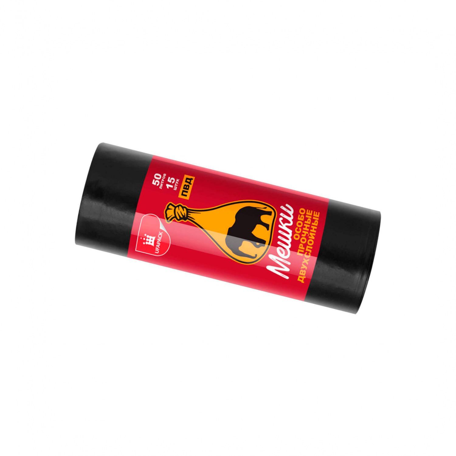 Мешки для мусора 50 л, черные, в рулоне 15 шт., ПВД, 22 мкм, 660х540 мм, Уфа Пак, МВ1458 (МВ 50-15ч)